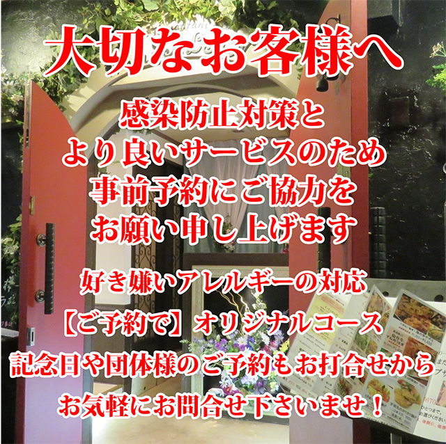 【入店時】 ・体調不良の方への自粛呼びかけあり・検温あり ・施設内のマスク着用依頼あり ・店内に消毒液設置・混雑時入店お断り ・客席へのご案内 ・テーブル毎に仕切りあり ・席毎に一定間隔あり ・他グループとの相席禁止 ・オーダー時にお客様と一定間隔保持 ・個室に換気設備あり【客席へのご案内】 テーブル毎に仕切りあり、席毎に一定間隔あり、他グループとの相席禁止 【テーブル/カウンターサービス】 オーダー時にお客様と一定間隔保持、個室に換気設備あり 【会計処理】 ・現金等受け渡し時の手渡しなし ・テイクアウトサービス ・テイクアウト用待ちスペースあり【テイクアウトサービス】 テイクアウト用待ちスペースあり |